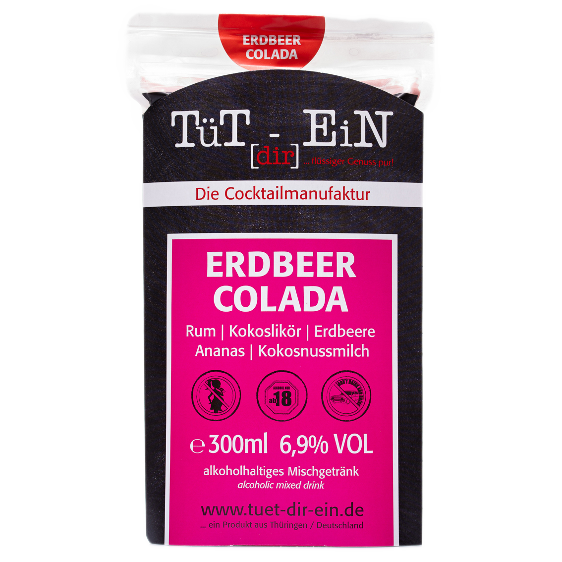 Der Tüt[dir]EiN Erdbeer Colada Cocktail ist ein Mixgetränk aus Havana Club und Kokos-Likör mit Erdbeer- und Ananassaft, Kokosnussmilch und einem Hauch Kokosnuss-Sirup.