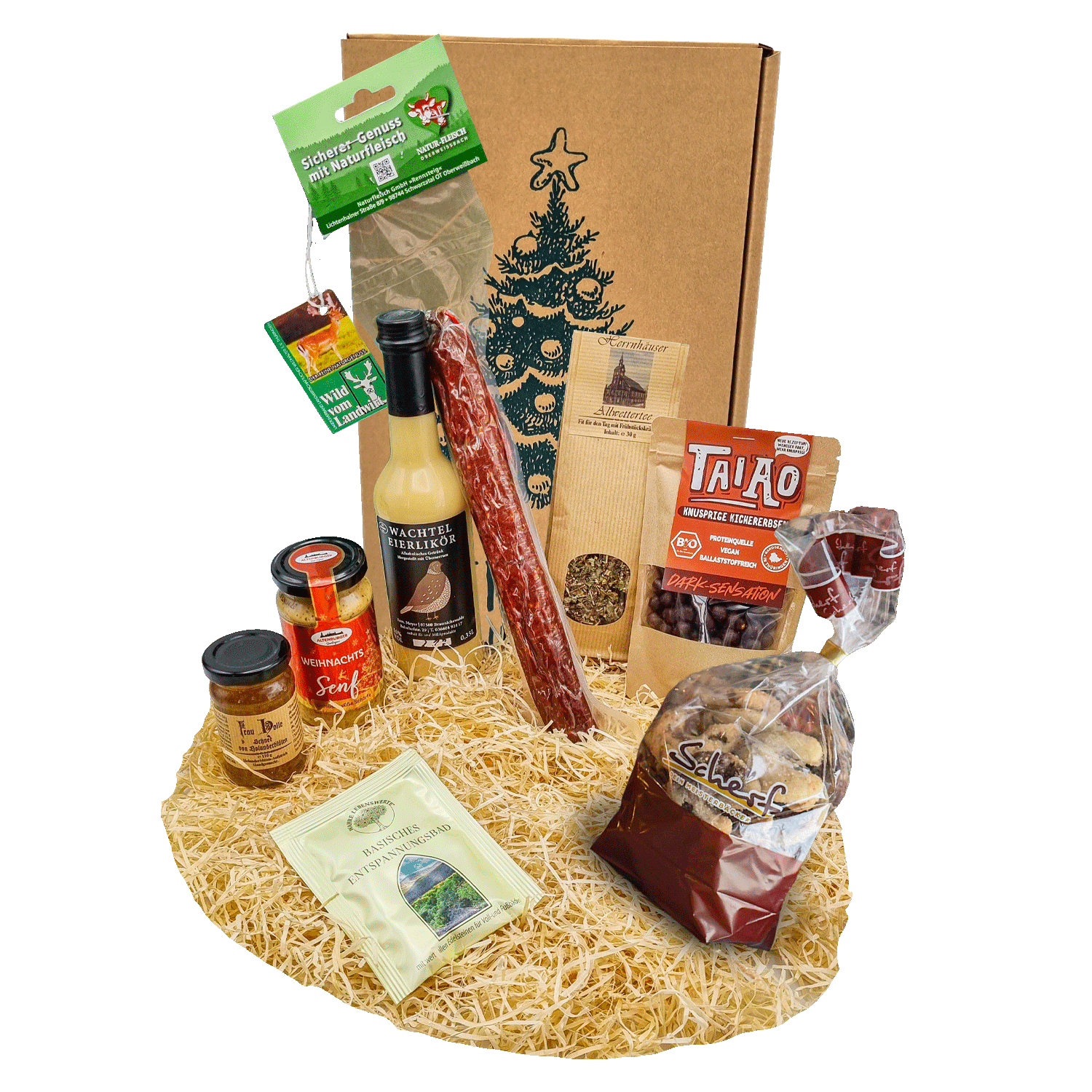 Der Versand erfolgt im weihnachtlichem Geschenkkarton, dieser wird neutral im Umkarton verpackt und somit geschützt. Alle Produkte werden auf Holzwolle gebettet.