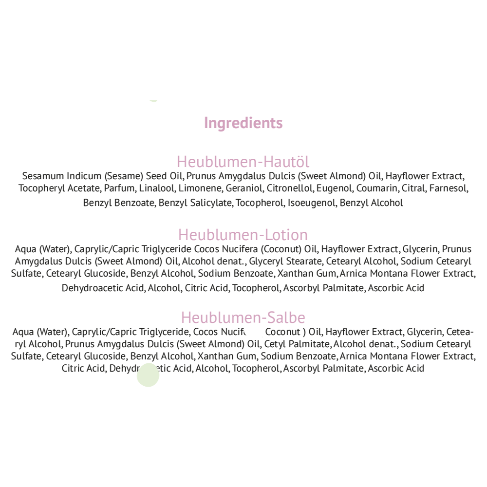 Heublumen-Lotion: Aqua (Water), Caprylic/Capric Triglyceride, Cocos Nucifera (Coconut) Oil, Hayflower Extract, Polyglyceryl-3 Methylglucose Distearate, Glycerin, Prunus Amygdalus Dulcis (Sweet Almond) Oil, Alcohol denat., Glyceryl Stearate, Cetearyl Alcohol, Benzyl Alcohol, Sodium Benzoate, Xanthan Gum, Arnica Montana Flower Extract, Citric Acid, Dehydroacetic Acid, Alcohol, Tocopherol, Ascorbyl Palmitate, Ascorbic Acid