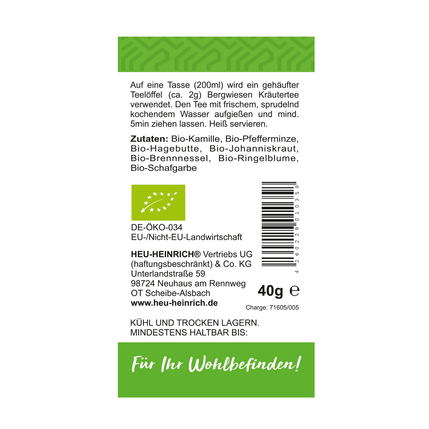 Bio-Bergwiesen-Kräutertee: Bio-Kamille, Bio-Pfefferminze, Bio-Hagebutte, Bio-Johanniskraut, Bio-Brennnessel, Bio-Schafgarbe