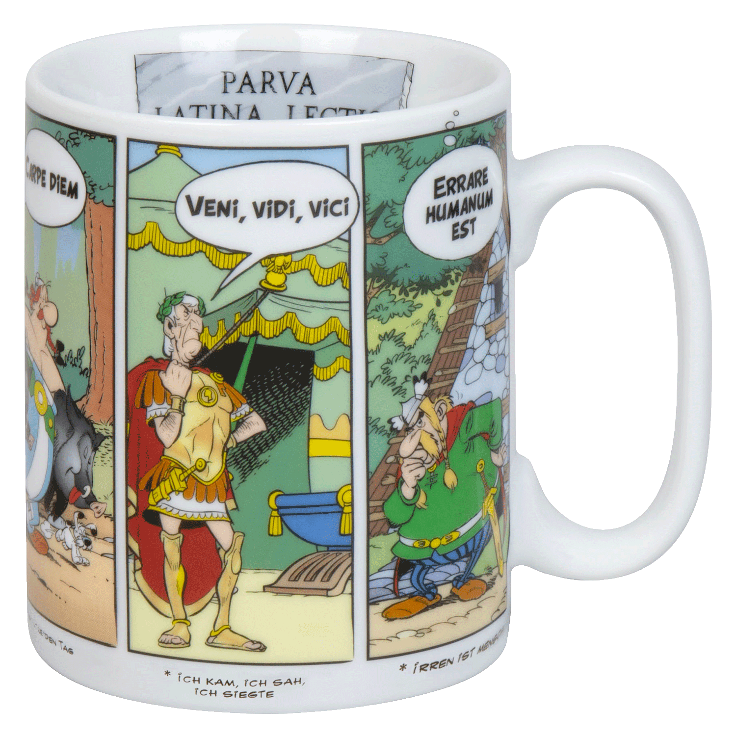 Zeige deine Liebe zu Asterix und den mutigen Galliern mit diesem einzigartigen Becher und genieße dein Heißgetränk umgeben von den legendären Sprüchen der Comic-Helden! Dieser detailreich gestaltete Becher aus hochwertigem Porzellan entführt dich direkt in das kleine gallische Dorf. Die farbenfrohen Illustrationen zeigen Asterix und Obelix in actionreichen Szenen, umgeben von ihren treuen Freunden und den lästigen Römern. Doch das Besondere an diesem Becher sind die verschiedenen Ausschnitte mit prägnanten Sprüchen wie "Carpe Diem" oder "Veni, Vidi, Vici".