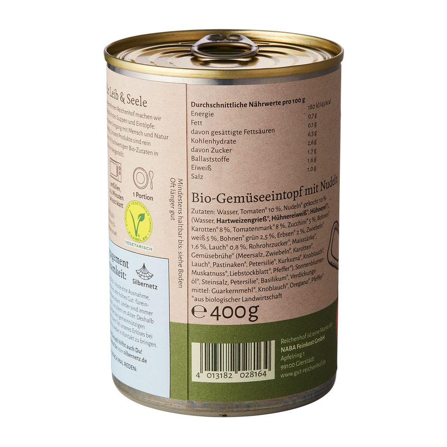 Wasser, Tomaten* 10 %, Nudeln* gekocht 10 % (Wasser, Hartweizengrieß*,
