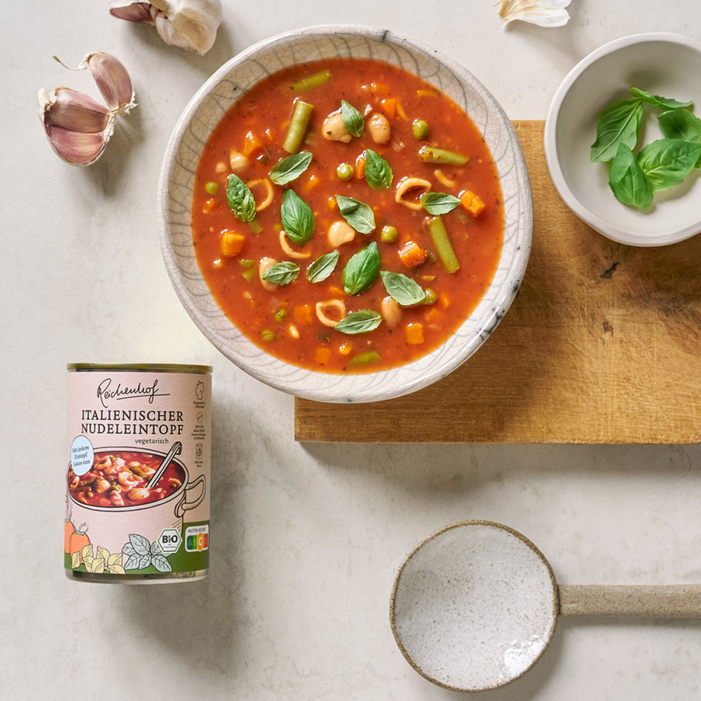 Inspiriert von der italienischen Minestrone: Nudeln, Tomaten und viel Gemüse sorgen für ein aromatisches und vollwertiges Gericht.