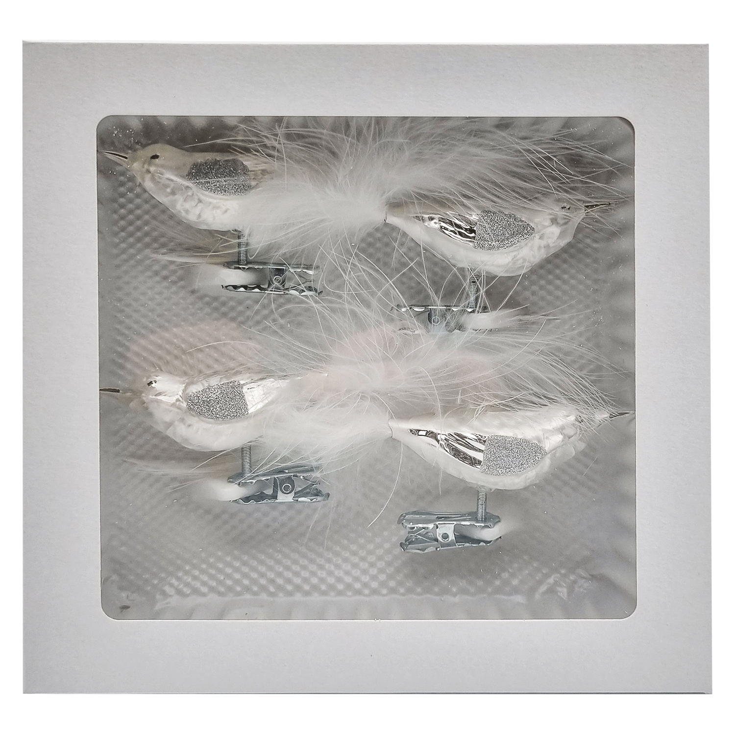 Vogel - silber, weiß - mit Glasfaßer-Schwanz - 4er Set