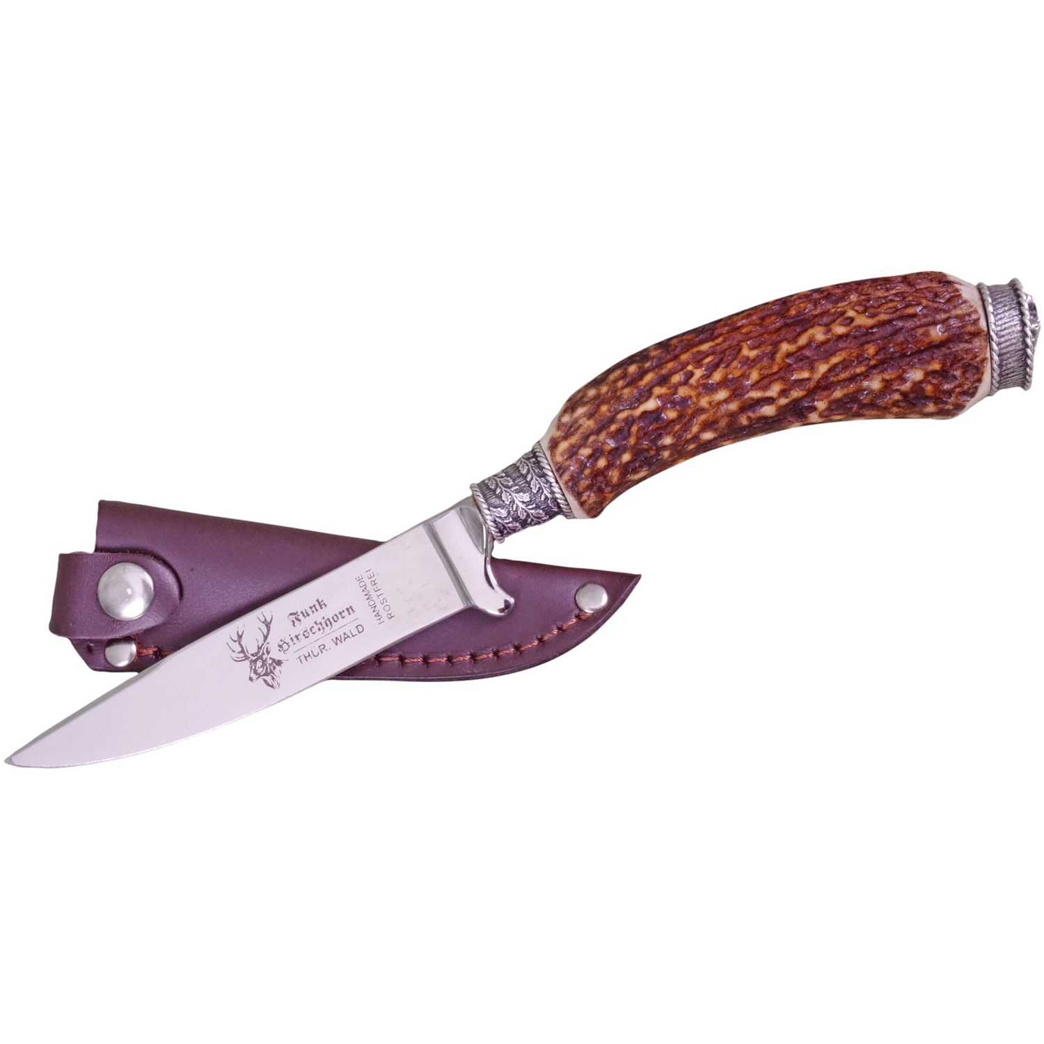 Das Trachtenmesser aus echtem Hirschhorn ist ein echter Klassiker. Die geschmiedete, rostfreie Klinge hat eine Länge von 100mm und wird mit einer Sicherheitslederscheide verdeckt. Der Griff besteht aus echtem Hirschhorn und die Beschlagteile sind antik versilbert. Als Motive für die Zierkappe sind Fuchs, Rothirsch, Wildschwein und mehr erhältlich.