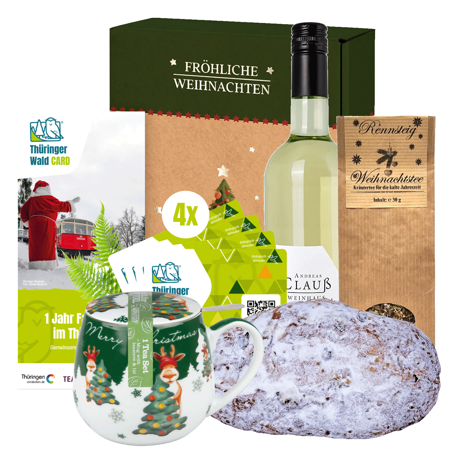 Das Paket enthält 4 Thüringer Wald Cards für Erwachsene in einer weihnachtlich gestalteten Geschenkhülle. Perfekt als Weihnachtsgeschenk. Die Karten sind ab Kauf 365 Tage gültig und können bei allen Partnern mehrmals eingesetzt werden. Je Erwachsenen-Karte ist ein Kind bis 12 Jahren inklusive.