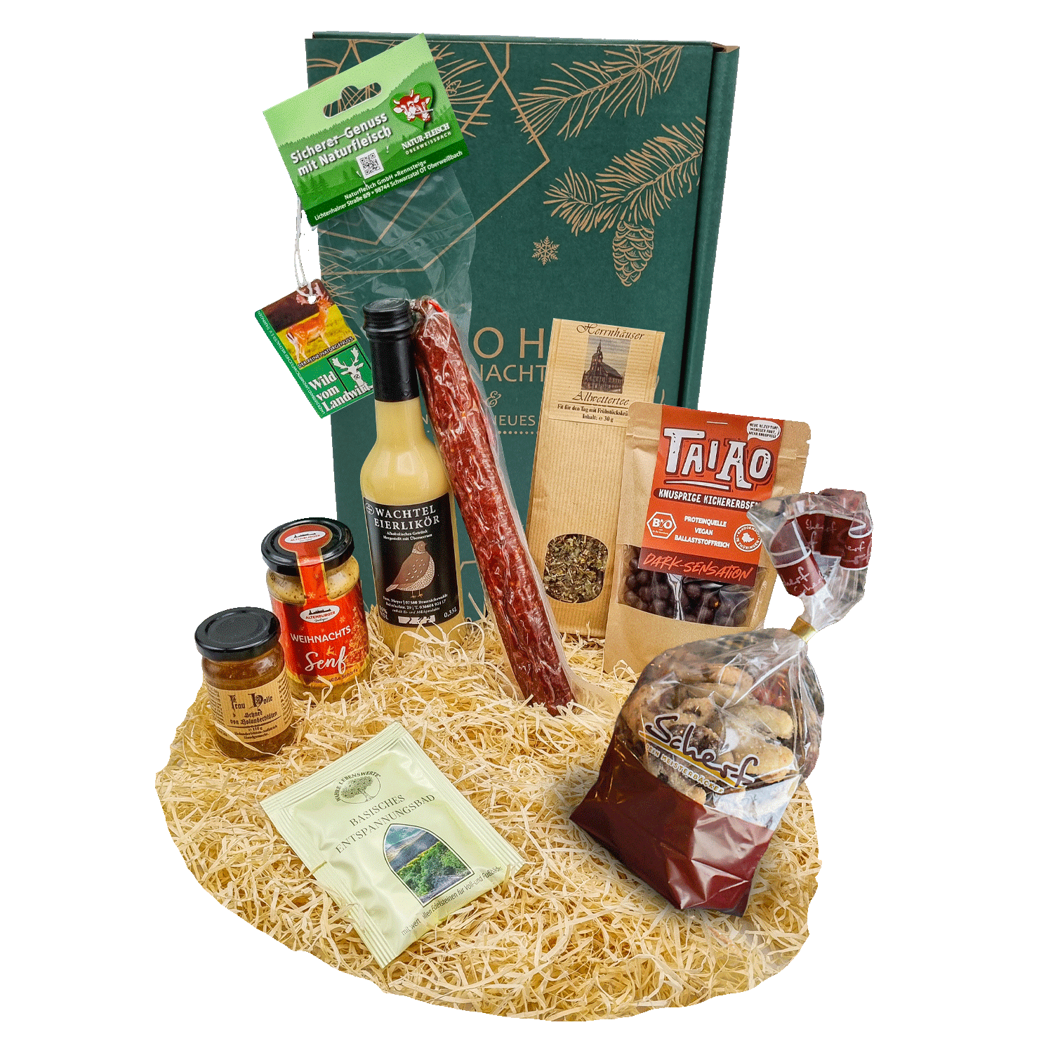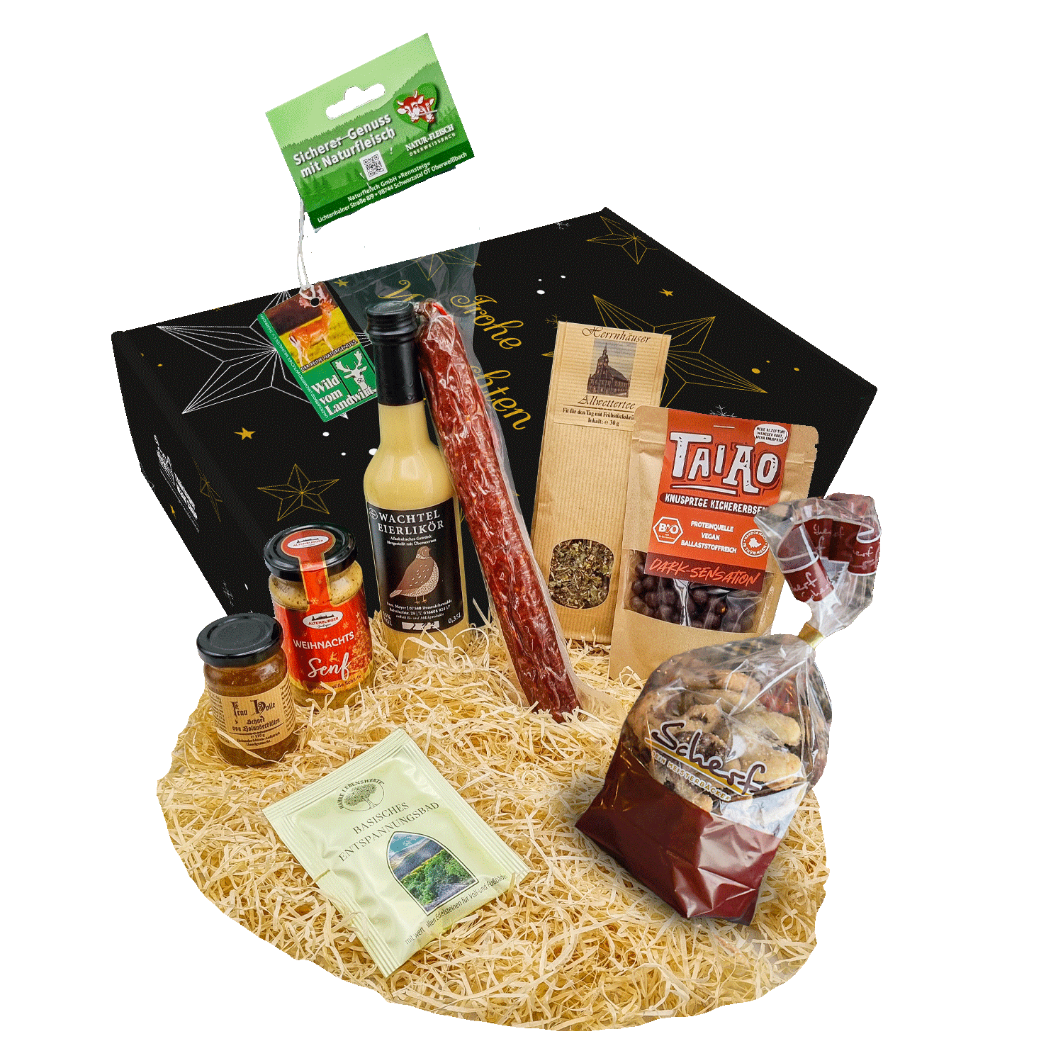 Der Versand erfolgt im weihnachtlichem Geschenkkarton, dieser wird neutral im Umkarton verpackt und somit geschützt. Alle Produkte werden auf Holzwolle gebettet.