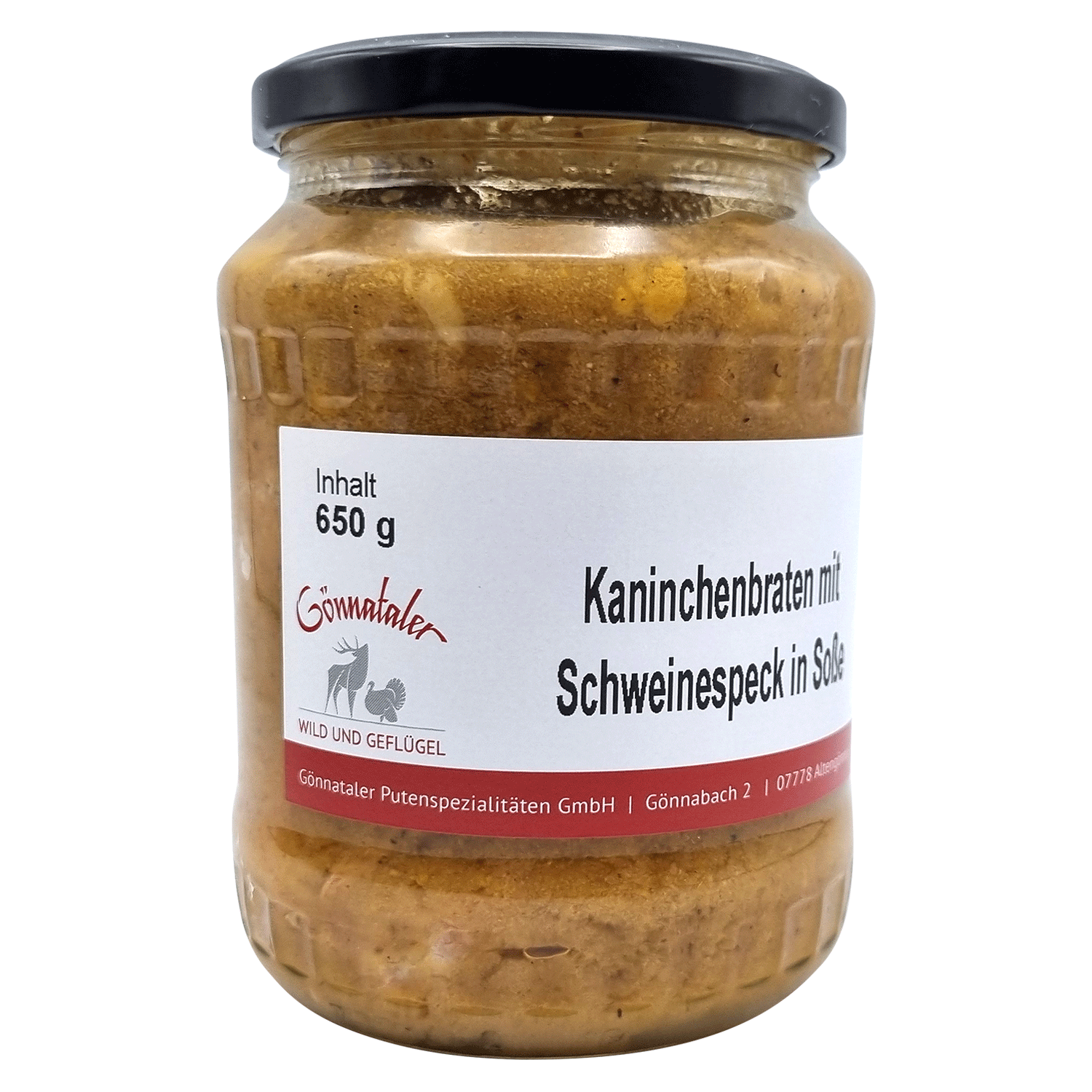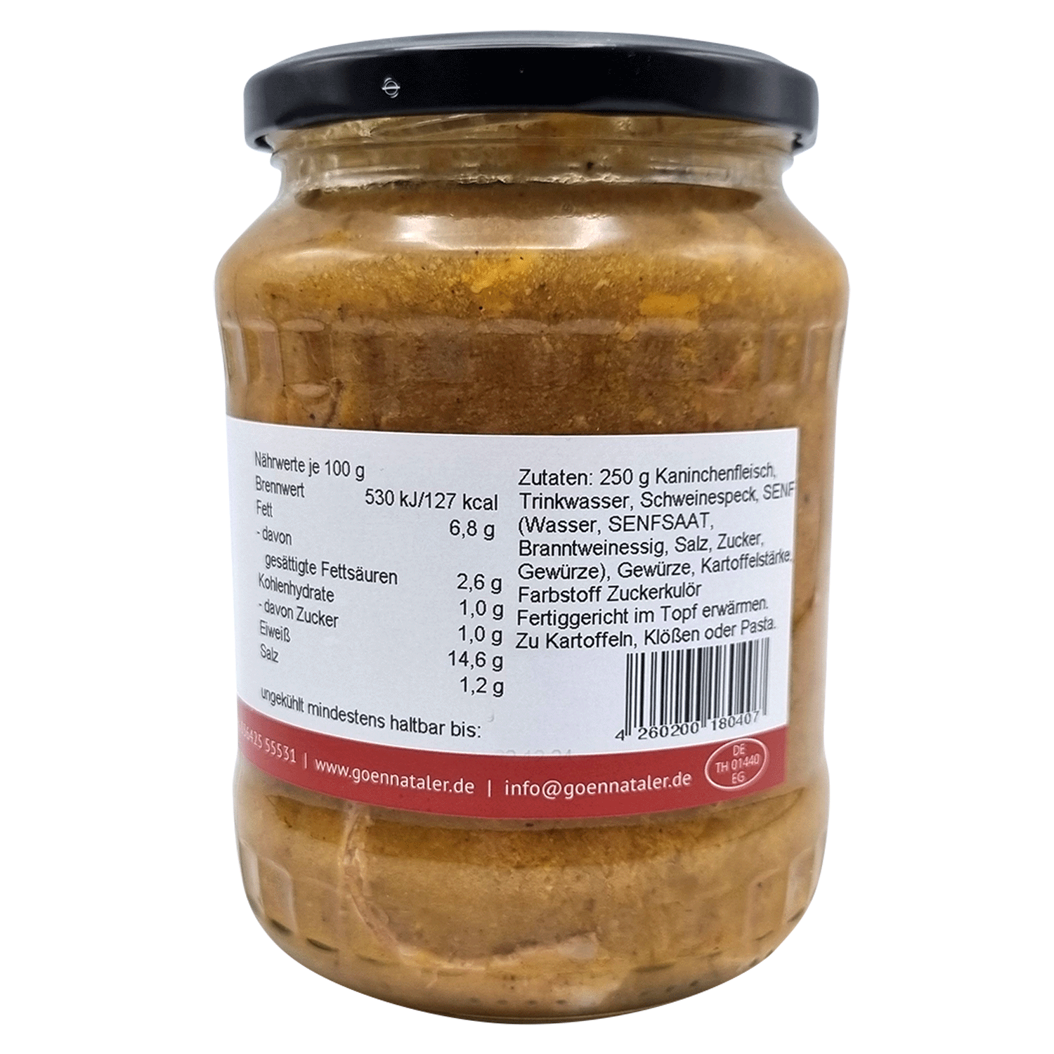 250g Kaninchenfleisch, Trinkwasser, Schweinespeck, Senf (Senfsaat, Wasser, Branntweinessig, Salz, Zucker, Gewürze), Gewürze, Kartoffelstärke, Farbstoff Zuckerkulör