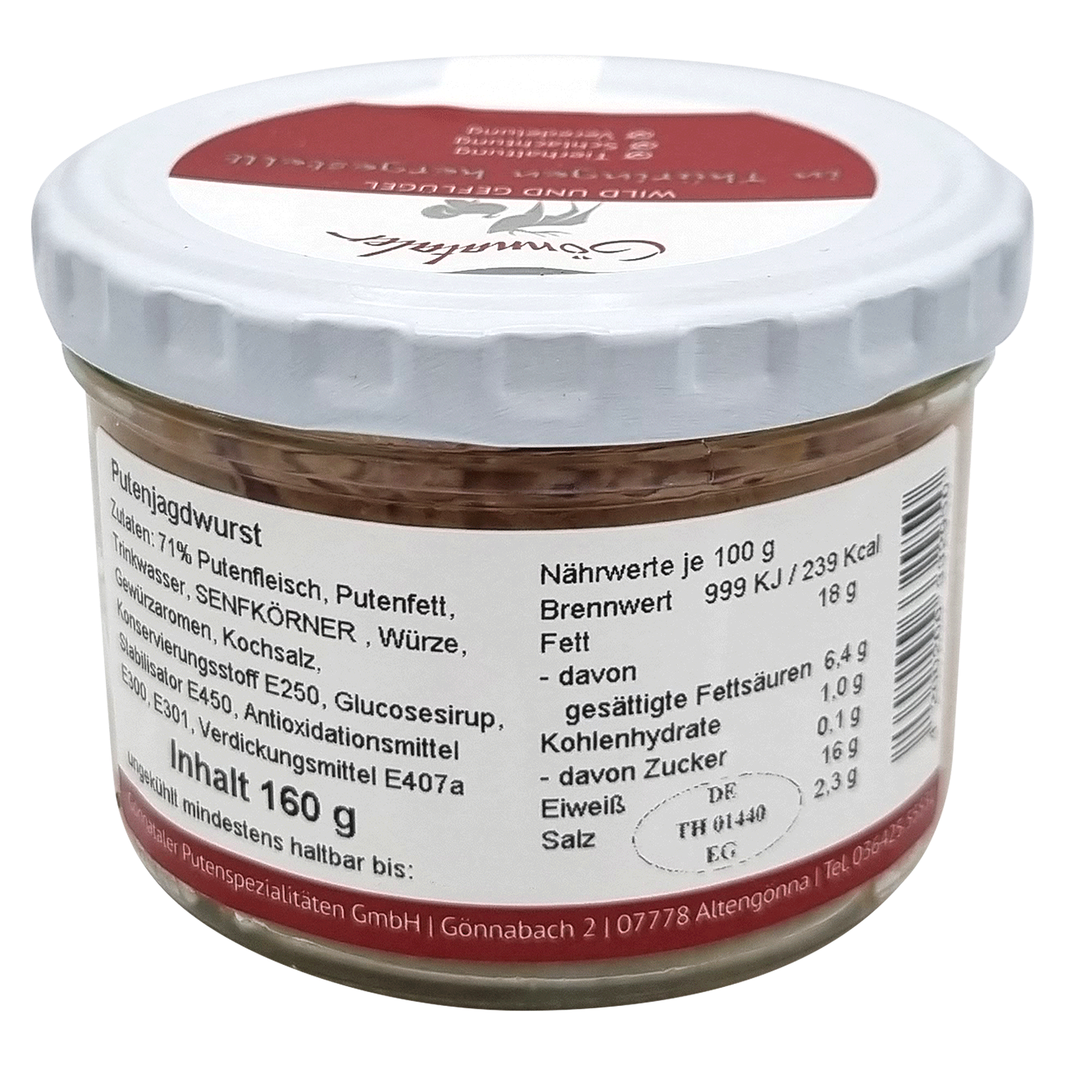 71% Putenfleisch, Putenfett. Trinkwasser, Senfkörner, Würze, Gewürzaromen, Kochsalz, Konservierungsstoff E250, Glucosesirup, Stabilisator E450, Antioxidationsmittel E300, E301, Verdickungsmittel E407a