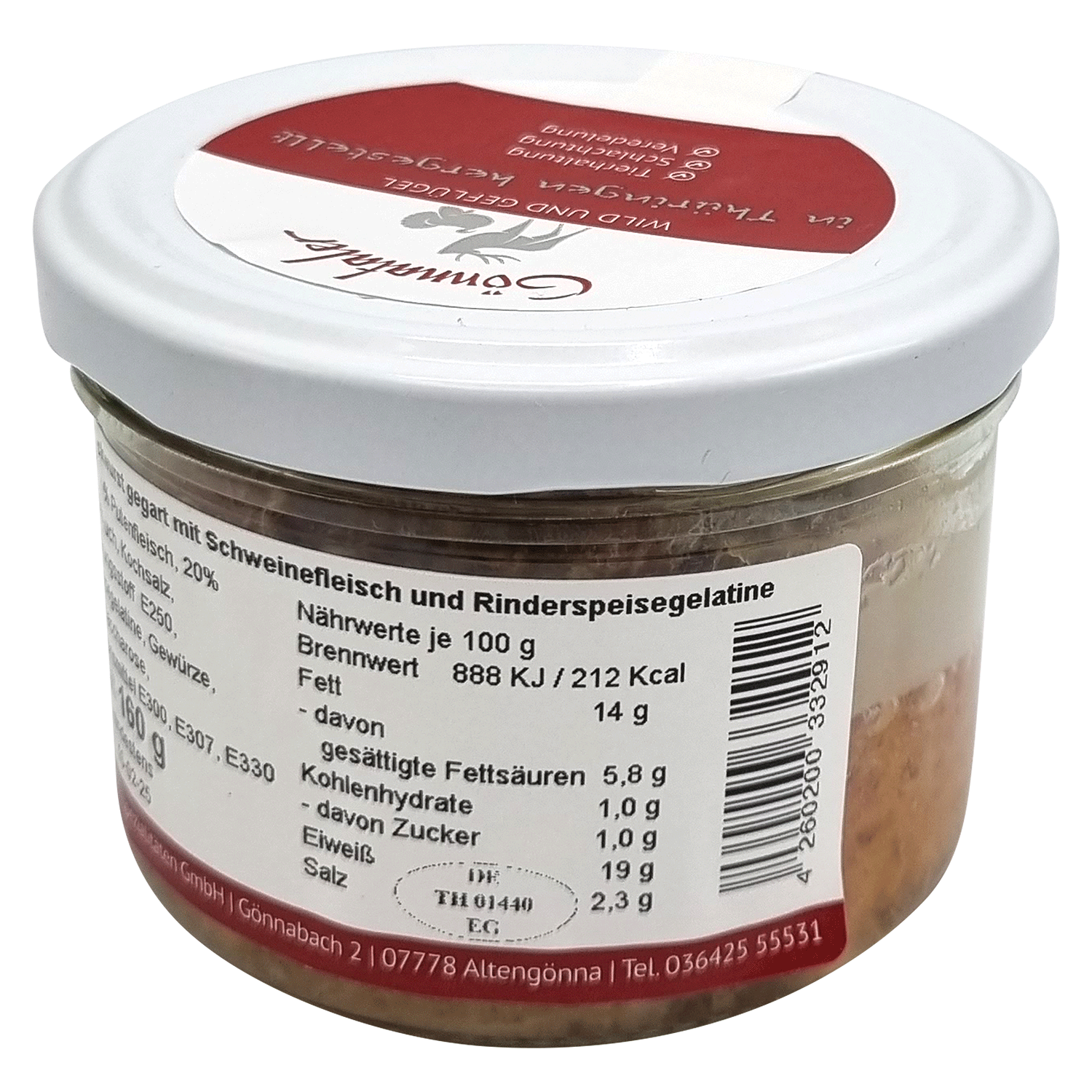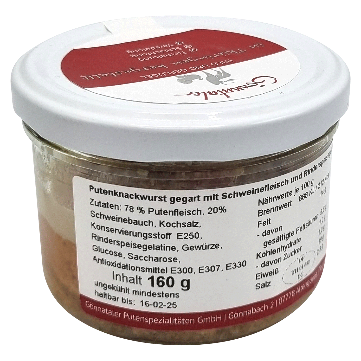 78% Putenfleisch, 20% Schweinebauch, Kochsalz, Konservierungsstoff E250, Rinderspeisegelantine, Gewürze, Glucose, Saccharose, Antioxidationsmittel E300, E307, E330